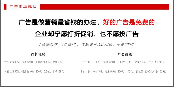 通过以上对品牌战略定位的详细分析,王江波老师点明了广告的本质,即:广告和渠道是实现战略的两大核心武器。其中,广告是帮助企业完成使命,实现“差异化传播”,通过广告的作用,重新撬动品牌的定位和知名度,让客户在选择时能够第一时间“想得到”;渠道则需要靠企业自身完成。纵观整个广告市场,那些能被人们第一时间想到并且选择的品牌往往在广告上有较大的投入,以此来不断增加顾客对品牌资源的认知。而一些小的企业,没有战略意识的品牌,在广告投放出现了一些认知上的偏差,因此更加偏向于流量营销。据数据显示,美国广告体量17000亿,人均广告消费体量5100元,日本广告体量3200亿元,人均人均广告消费体量2600元,中国广告体量11000亿,人均广告消费体量仅800元。由此可见,中国企业对广告的认知相对初级,品牌方广告的投放量也远远不够。随即,王江波老师通过对打折促销和广告投放两种营销手段下营收的对比,指出广告是做营销最省钱的办法,好的广告是免费的。