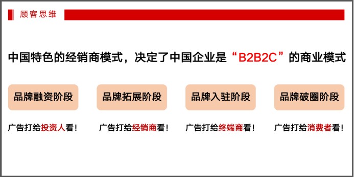 既然品牌广告的重要性不言而喻,那问题来了,什么才是真正被企业所需的品牌广告?如何构建真正有价值的品牌广告?分享会上,王江波老师一一做出了回答。王江波老师提到:中国特色的经销商模式,决定了中国企业是“B2B2C”的商业模式,也决定了中国广告的投放逻辑是有所不同的。